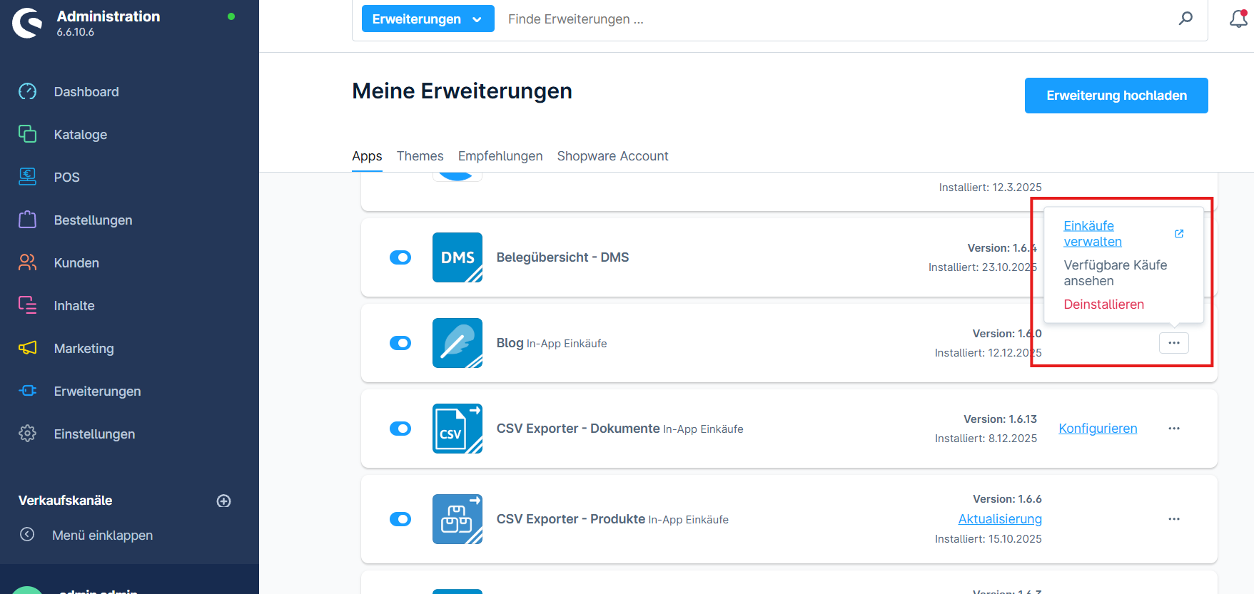 Wenn du ein Add-on kaufen möchtest, drücke auf „Einkäufe verwalten“ – du wirst dann automatisch zur Shopware-Seite weitergeleitet {Bild 1: Add-ons}.