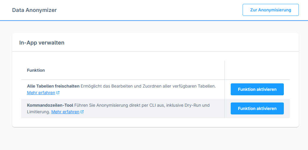 Wenn du ein Add-on kaufen möchtest, gehe in die Plugin-Konfiguration und klicke auf „In-App-Funktionen verwalten“. {Bild 3: Add-on Navigation} {Bild 4: Add-on Aktivierung}