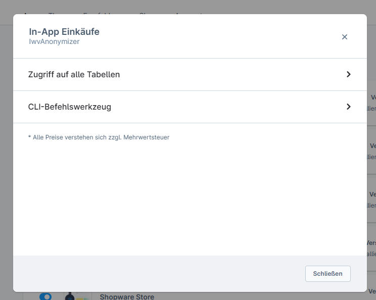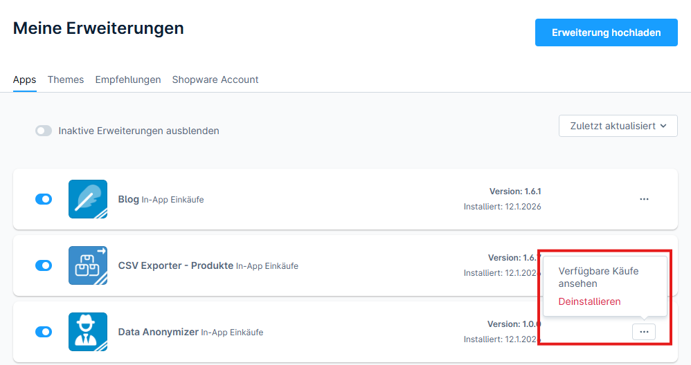 Um alle verfügbaren Add-ons zu sehen, gehe zu „Erweiterungen“, klicke beim Plugin „Datenanonymisierung“ auf die drei Punkte und wähle „Verfügbare Käufe ansehen“.
