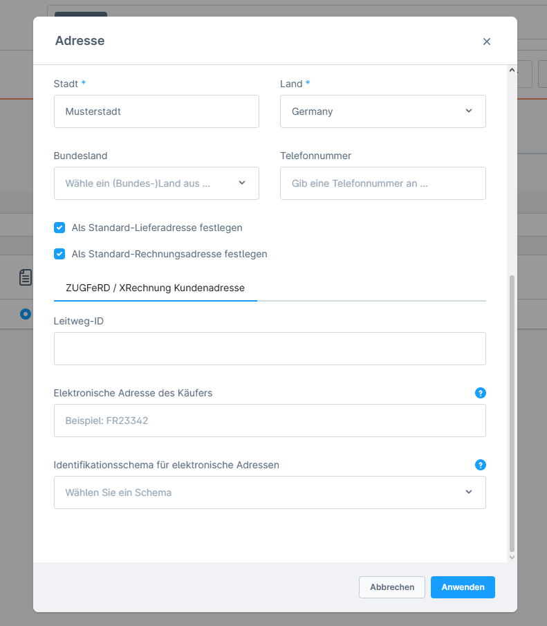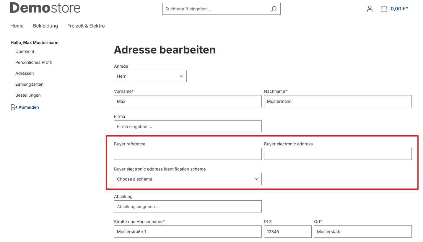 Angemeldete Benutzer können die Felder „Käuferreferenz“, „Elektronische Adresse des Käufers“ und „Identifikationsschema für elektronische Adressen“ in den benutzerdefinierten Feldern der Kundenadresse hinterlegen.