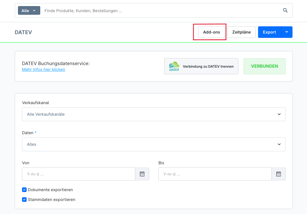 Gehe zu „Bestellungen > DATEV“ und klicke auf „Add-ons“ {Bild 1: Add-ons}.