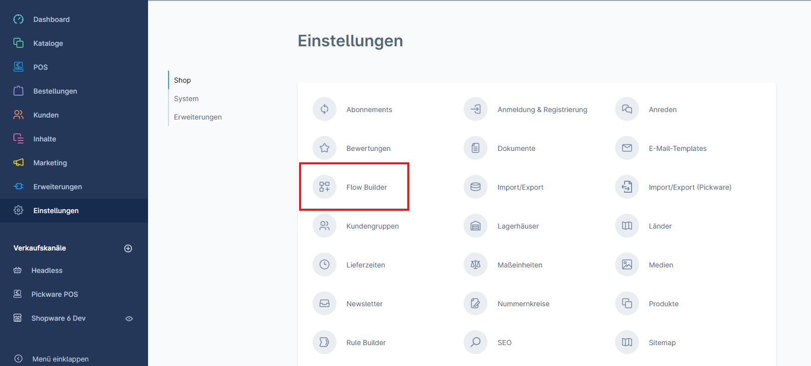 Gehe zu „Einstellungen > Shop > Flow Builder“ {Bild 1: Flow Builder Navigation}.