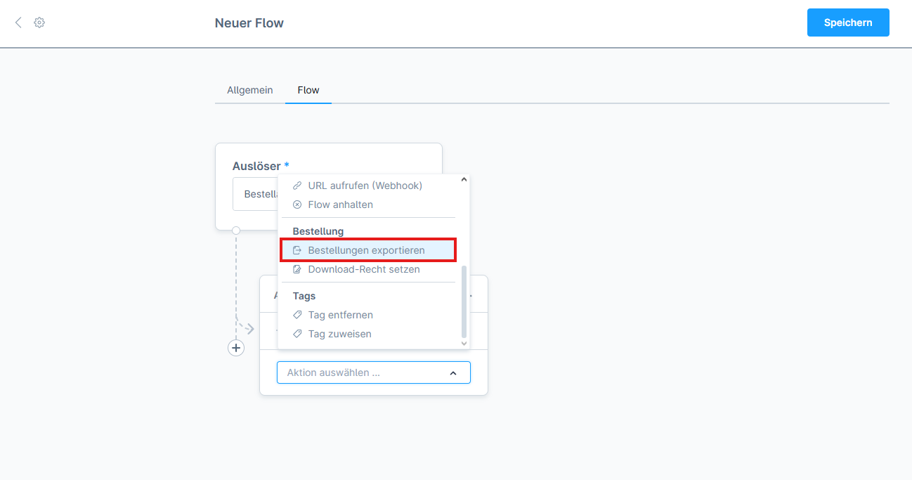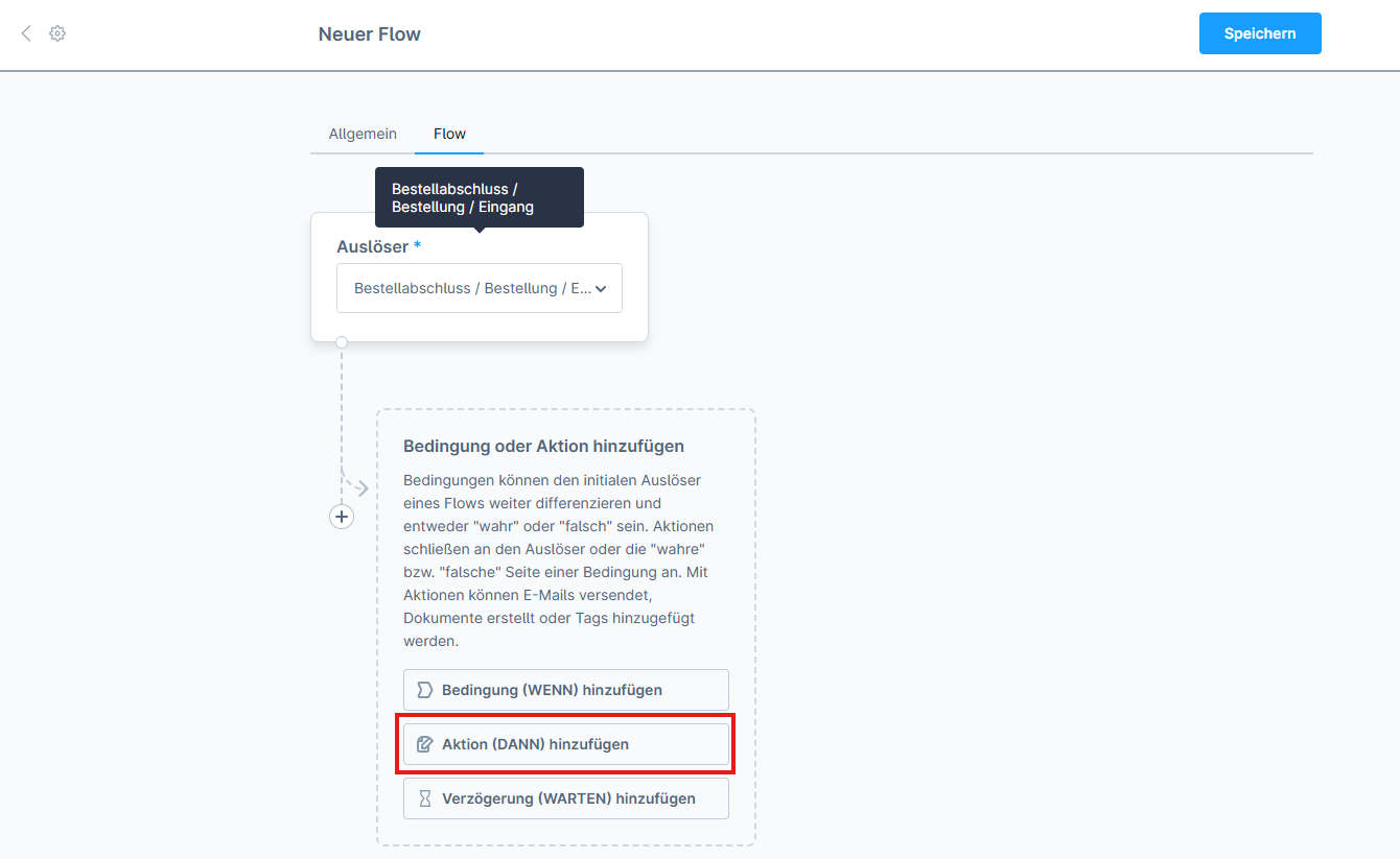Wähle im Tab „Flow“ zuerst eine Aktion (WENN) aus, zum Beispiel „Bestellabschluss / Bestellung / Eingang“ {Bild 2: Aktion Auswahl}.